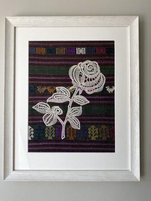 We decided to frame the lace roses we sourced against a subtly colourful, woven, Thai-silk textile. The delicate patterning somehow just works as a backdrop to the lace rose. We hope you love the culture clash as much as we do.