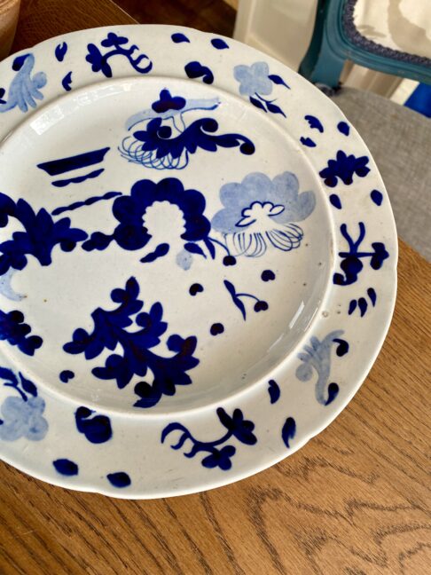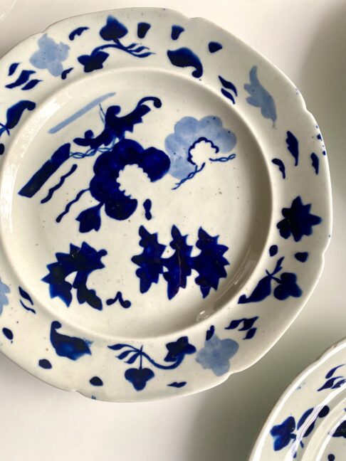 The Product: Antique decorative wall plates set in blue and white pearlware
