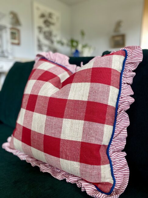 Luxury red check cushions with a frill. These generously sized scatter cushions are handmade from a vintage French linen check and pack a punch on any sofa, bed, or daybed. They’re not just a little like super-sized red gingham cushions. The jaunty, scarlet check cushion cover has a matching red pinstripe frill and blue contrast piping made from Irish linen: timeless and fun!