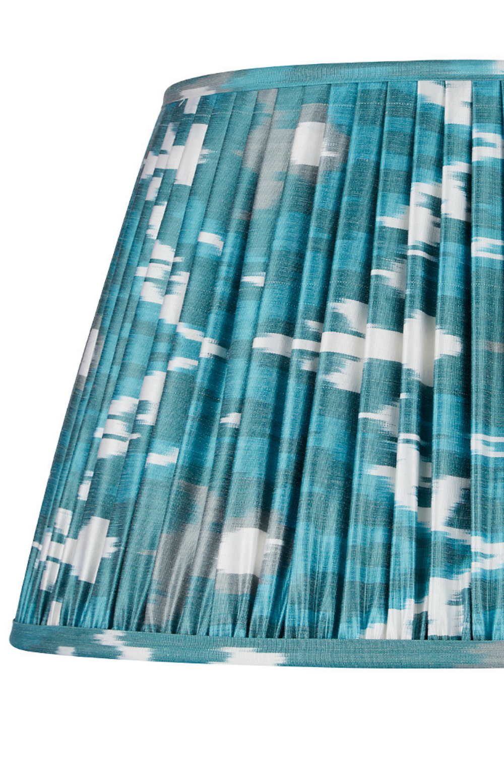These elegant, teal silk Ikat lampshades from the Rosanna Lonsdale range are created using hand-dyed fabric that is woven in Uzbekistan to ancient textile designs. Lampshades are then made up in London by hand.